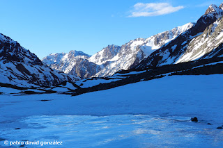 Luego de 4 horas de marcha, alcanzamos el sitio de campamento de la última vez. Ahora preferimos armar otro unos metros más al sur, debido a que el anterior estaba muy expuesto al viento. Contentos de llegar temprano para descansar lo necesario, lo único que nos preocupa son las nubes de viento que han cubierto el cielo. Mijel viene de dar un curso de Guías en el Noroeste Argentino, donde por el viento debieron abortar un ascenso al Incahuasi, así que no quiere saber nada más de ese "enemigo invisible". Yo por mi parte estoy dispuesto a esperar "agazapado" al momento justo de buen tiempo para poder salir disparado hacia la cumbre. Dentro de los días disponibles, hemos previsto una jornada para esperar por mal tiempo si fuera necesario. Pero esta vez no contamos con ningún sistema de comunicación (teléfono satelital) por lo que nos debemos mover ajustandonos estrictamente al plan establecido. La tarde transcurre tranquila, mirando de reojo a nuestro objetivo y esbozando nuevas líneas de ascenso. Los glaciares están bastantes más "pelados" que en 2009, por lo que nos decidimos por una línea cercana al filo Oeste que nos lleve directamente a la cumbre. La ruta del glaciar Sur es bastante más larga y desde aquí no podemos observar en que estado está el glaciar. Por lo que se puede observar desde aquí, los glaciares poseen ese "hielo vidrio" increíblemente duro y difícil para nuestro escaso equipo.