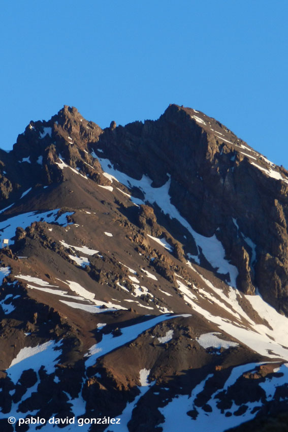 Me asomo hacia el otro lado y una pared vertical se abre hacia la cara Sur del cerro, impidiendo cualquier intento de ascensión por ese flanco. Hacia el Suroeste continúa un filo compuesto por agujas de roca descompuesta. Hacia el Norte, un espolón de roca y nieve que suponemos debe rematar en la cima. No queda otra que intentar por este lado. Lito se encarama en el espolón sin mochila a echar una ojeada y al cabo de unos minutos me dice que luego del primer resalte se puede continuar ascendiendo unos metros más. Le alcanzo su mochila y continuamos. Entramos en otro canal de nieve que remata al pie de una pared. Buscamos algún punto débil en la pared escalando por distintos sectores, pero después de trepar y destrepar, comprobamos que no es posbile pasar por allí y minutos más tarde estamos de vuelta en el canal. Lito intenta justo por el espolón que estaba desprovisto de nieve y en el cual era más fácil ver los bloques sueltos y va superando metro a metro los resaltes. Lo voy siguiendo mientras me cubro de los bloques que se van desprendiendo. Yo no estoy muy convencido si vale la pena intentarlo dado que la roca es de muy mala calidad y hay que tener mucho cuidado, además de no saber hacia donde está la cumbre. Vamos siguiendo el espolón hacia la parte más alta y luego de una travesía fácil pero expuesta, salimos a un nevé, superamos otro resalte de roca y vemos otros peñones rocosos donde rematan canales de nieve. Hacia allá vamos, ahora confiando en que la cima no puede estar muy lejos, dada la altura que nos viene marcando el altímetro. Me adelanto y ya parado sobre el punto más alto libero la incertidumbre de la última parte de la ascensión, dando unos buenos gritos hacia la pared Este. No puedo creer que hayamos alcanzado la cumbre, dado lo complicado que se había presentado la búsqueda de la ruta en las travesías para encontrar el canal de nieve y luego en los diferentes resaltes que tuvimos que superar. Son las dos menos cuarto y ahora sí nos podemos sentar a disfrutar un rato del sol y de la espléndida vista que tenemos.